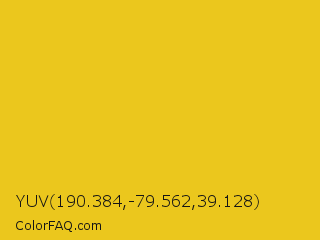 YUV 190.384,-79.562,39.128 Color is a normal yellow color and the nearest color is Deep Lemon #f5c71a. Hex code #ebc71d and RGB value is rgb(235,199,29). In RGB color space, this color is composed of 92% red, 78% green, 11% blue, In CMYK color space, this color is composed of 0% cyan, 15% magenta, 88% yellow , 8% black , In HSL color space, this color has a hue angle of 50° , 84% saturation and 52% lightness.