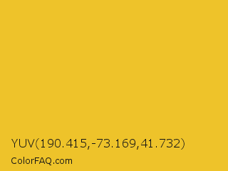 YUV 190.415,-73.169,41.732 Color is a normal yellow color and the nearest color is Saffron #f4c430. Hex code #eec32a and RGB value is rgb(238,195,42). In RGB color space, this color is composed of 93% red, 76% green, 16% blue, In CMYK color space, this color is composed of 0% cyan, 18% magenta, 82% yellow , 7% black , In HSL color space, this color has a hue angle of 47° , 85% saturation and 55% lightness.