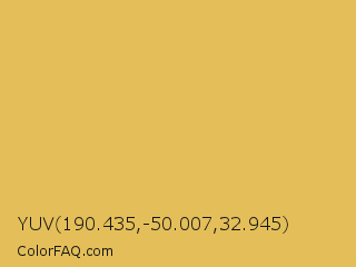 YUV 190.435,-50.007,32.945 Color is a light orange color and the nearest color is Equator #e1bc64. Hex code #e4bf59 and RGB value is rgb(228,191,89). In RGB color space, this color is composed of 89% red, 75% green, 35% blue, In CMYK color space, this color is composed of 0% cyan, 16% magenta, 61% yellow , 11% black , In HSL color space, this color has a hue angle of 44° , 72% saturation and 62% lightness.