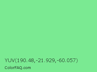 YUV 190.48,-21.929,-60.057 Color is a light green color and the nearest color is Light Green #90ee90. Hex code #7aea92 and RGB value is rgb(122,234,146). In RGB color space, this color is composed of 48% red, 92% green, 57% blue, In CMYK color space, this color is composed of 48% cyan, 0% magenta, 38% yellow , 8% black , In HSL color space, this color has a hue angle of 133° , 73% saturation and 70% lightness.