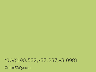 YUV 190.532,-37.237,-3.098 Color is a light lime color and the nearest color is Wild Willow #b9c46a. Hex code #bbcf73 and RGB value is rgb(187,207,115). In RGB color space, this color is composed of 73% red, 81% green, 45% blue, In CMYK color space, this color is composed of 10% cyan, 0% magenta, 44% yellow , 19% black , In HSL color space, this color has a hue angle of 73° , 49% saturation and 63% lightness.