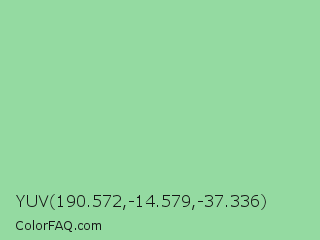 YUV 190.572,-14.579,-37.336 Color is a light green color and the nearest color is Granny Smith Apple Crayola #9de093. Hex code #94daa1 and RGB value is rgb(148,218,161). In RGB color space, this color is composed of 58% red, 85% green, 63% blue, In CMYK color space, this color is composed of 32% cyan, 0% magenta, 26% yellow , 15% black , In HSL color space, this color has a hue angle of 131° , 49% saturation and 72% lightness.