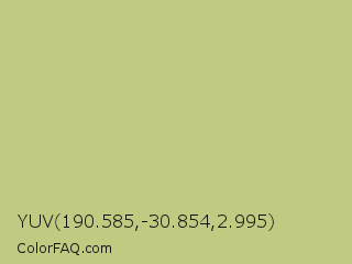 YUV 190.585,-30.854,2.995 Color is a light yellow color and the nearest color is Pine Glade #c7cd90. Hex code #c2c980 and RGB value is rgb(194,201,128). In RGB color space, this color is composed of 76% red, 79% green, 50% blue, In CMYK color space, this color is composed of 3% cyan, 0% magenta, 36% yellow , 21% black , In HSL color space, this color has a hue angle of 66° , 40% saturation and 65% lightness.