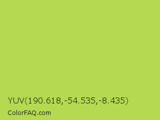 YUV 190.618,-54.535,-8.435 Color is a normal lime color and the nearest color is Conifer #acdd4d. Hex code #b5d950 and RGB value is rgb(181,217,80). In RGB color space, this color is composed of 71% red, 85% green, 31% blue, In CMYK color space, this color is composed of 17% cyan, 0% magenta, 63% yellow , 15% black , In HSL color space, this color has a hue angle of 76° , 64% saturation and 58% lightness.