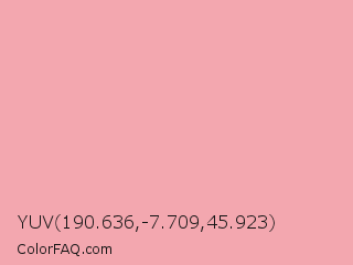 YUV 190.636,-7.709,45.923 Color is a light red color and the nearest color is Wewak #f19bab. Hex code #f3a7af and RGB value is rgb(243,167,175). In RGB color space, this color is composed of 95% red, 65% green, 69% blue, In CMYK color space, this color is composed of 0% cyan, 31% magenta, 28% yellow , 5% black , In HSL color space, this color has a hue angle of 354° , 76% saturation and 80% lightness.