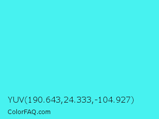 YUV 190.643,24.333,-104.927 Color is a light cyan color and the nearest color is Turquoise #40e0d0. Hex code #47f2f0 and RGB value is rgb(71,242,240). In RGB color space, this color is composed of 28% red, 95% green, 94% blue, In CMYK color space, this color is composed of 71% cyan, 0% magenta, 1% yellow , 5% black , In HSL color space, this color has a hue angle of 179° , 87% saturation and 61% lightness.