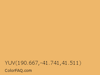 YUV 190.667,-41.741,41.511 Color is a light orange color and the nearest color is Rajah #f7b668. Hex code #eeb76a and RGB value is rgb(238,183,106). In RGB color space, this color is composed of 93% red, 72% green, 42% blue, In CMYK color space, this color is composed of 0% cyan, 23% magenta, 55% yellow , 7% black , In HSL color space, this color has a hue angle of 35° , 80% saturation and 67% lightness.