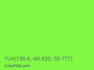 YUV 190.6,-60.935,-55.777 Color is a light green color and the nearest color is Kiwi #8ee53f. Hex code #7ff743 and RGB value is rgb(127,247,67). In RGB color space, this color is composed of 50% red, 97% green, 26% blue, In CMYK color space, this color is composed of 49% cyan, 0% magenta, 73% yellow , 3% black , In HSL color space, this color has a hue angle of 100° , 92% saturation and 62% lightness.