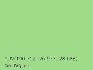 YUV 190.712,-26.973,-28.688 Color is a light green color and the nearest color is Feijoa #9fdd8c. Hex code #9eda88 and RGB value is rgb(158,218,136). In RGB color space, this color is composed of 62% red, 85% green, 53% blue, In CMYK color space, this color is composed of 28% cyan, 0% magenta, 38% yellow , 15% black , In HSL color space, this color has a hue angle of 104° , 53% saturation and 69% lightness.