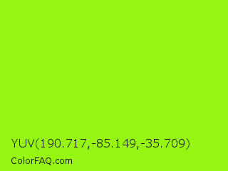 YUV 190.717,-85.149,-35.709 Color is a normal green color and the nearest color is Spring Bud #a7fc00. Hex code #96f512 and RGB value is rgb(150,245,18). In RGB color space, this color is composed of 59% red, 96% green, 7% blue, In CMYK color space, this color is composed of 39% cyan, 0% magenta, 93% yellow , 4% black , In HSL color space, this color has a hue angle of 85° , 92% saturation and 52% lightness.