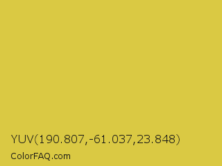 YUV 190.807,-61.037,23.848 Color is a normal yellow color and the nearest color is Wattle #dcd747. Hex code #dac943 and RGB value is rgb(218,201,67). In RGB color space, this color is composed of 85% red, 79% green, 26% blue, In CMYK color space, this color is composed of 0% cyan, 8% magenta, 69% yellow , 15% black , In HSL color space, this color has a hue angle of 53° , 67% saturation and 56% lightness.