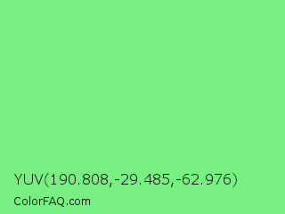 YUV 190.808,-29.485,-62.976 Color is a light green color and the nearest color is Very Light Malachite Green #64e986. Hex code #77ef83 and RGB value is rgb(119,239,131). In RGB color space, this color is composed of 47% red, 94% green, 51% blue, In CMYK color space, this color is composed of 50% cyan, 0% magenta, 45% yellow , 6% black , In HSL color space, this color has a hue angle of 126° , 79% saturation and 70% lightness.