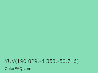 YUV 190.829,-4.353,-50.716 Color is a light green color and the nearest color is Pearl Aqua #88d8c0. Hex code #85deb6 and RGB value is rgb(133,222,182). In RGB color space, this color is composed of 52% red, 87% green, 71% blue, In CMYK color space, this color is composed of 40% cyan, 0% magenta, 18% yellow , 13% black , In HSL color space, this color has a hue angle of 153° , 57% saturation and 70% lightness.
