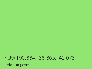 YUV 190.834,-38.865,-41.073 Color is a light green color and the nearest color is Pastel Green #77dd77. Hex code #90e670 and RGB value is rgb(144,230,112). In RGB color space, this color is composed of 56% red, 90% green, 44% blue, In CMYK color space, this color is composed of 37% cyan, 0% magenta, 51% yellow , 10% black , In HSL color space, this color has a hue angle of 104° , 70% saturation and 67% lightness.