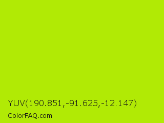 YUV 190.851,-91.625,-12.147 Color is a normal lime color and the nearest color is Inch Worm #b0e313. Hex code #b1ea05 and RGB value is rgb(177,234,5). In RGB color space, this color is composed of 69% red, 92% green, 2% blue, In CMYK color space, this color is composed of 24% cyan, 0% magenta, 98% yellow , 8% black , In HSL color space, this color has a hue angle of 75° , 96% saturation and 47% lightness.
