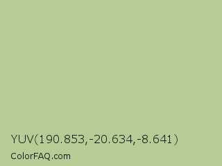 YUV 190.853,-20.634,-8.641 Color is a light green color and the nearest color is Pine Glade #c7cd90. Hex code #b5cc95 and RGB value is rgb(181,204,149). In RGB color space, this color is composed of 71% red, 80% green, 58% blue, In CMYK color space, this color is composed of 11% cyan, 0% magenta, 27% yellow , 20% black , In HSL color space, this color has a hue angle of 85° , 35% saturation and 69% lightness.
