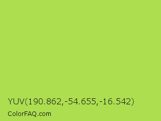 YUV 190.862,-54.655,-16.542 Color is a normal green color and the nearest color is Conifer #acdd4d. Hex code #acde50 and RGB value is rgb(172,222,80). In RGB color space, this color is composed of 67% red, 87% green, 31% blue, In CMYK color space, this color is composed of 23% cyan, 0% magenta, 64% yellow , 13% black , In HSL color space, this color has a hue angle of 81° , 68% saturation and 59% lightness.