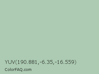 YUV 190.881,-6.35,-16.559 Color is a light green color and the nearest color is Spring Rain #accbb1. Hex code #accbb2 and RGB value is rgb(172,203,178). In RGB color space, this color is composed of 67% red, 80% green, 70% blue, In CMYK color space, this color is composed of 15% cyan, 0% magenta, 12% yellow , 20% black , In HSL color space, this color has a hue angle of 132° , 23% saturation and 74% lightness.