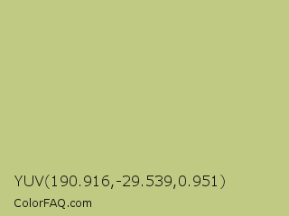 YUV 190.916,-29.539,0.951 Color is a light yellow color and the nearest color is Pine Glade #c7cd90. Hex code #c0ca83 and RGB value is rgb(192,202,131). In RGB color space, this color is composed of 75% red, 79% green, 51% blue, In CMYK color space, this color is composed of 5% cyan, 0% magenta, 35% yellow , 21% black , In HSL color space, this color has a hue angle of 68° , 40% saturation and 65% lightness.