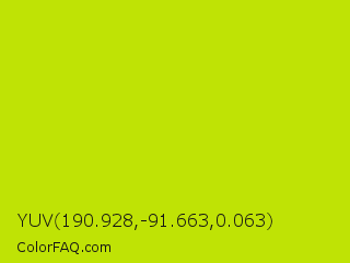 YUV 190.928,-91.663,0.063 Color is a normal yellow color and the nearest color is Fuego #bede0d. Hex code #bfe305 and RGB value is rgb(191,227,5). In RGB color space, this color is composed of 75% red, 89% green, 2% blue, In CMYK color space, this color is composed of 16% cyan, 0% magenta, 98% yellow , 11% black , In HSL color space, this color has a hue angle of 70° , 96% saturation and 45% lightness.