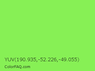 YUV 190.935,-52.226,-49.055 Color is a light green color and the nearest color is Kiwi #8ee53f. Hex code #87f055 and RGB value is rgb(135,240,85). In RGB color space, this color is composed of 53% red, 94% green, 33% blue, In CMYK color space, this color is composed of 44% cyan, 0% magenta, 65% yellow , 6% black , In HSL color space, this color has a hue angle of 101° , 84% saturation and 64% lightness.