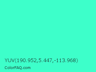YUV 190.952,5.447,-113.968 Color is a light cyan color and the nearest color is Turquoise #40e0d0. Hex code #3dffca and RGB value is rgb(61,255,202). In RGB color space, this color is composed of 24% red, 100% green, 79% blue, In CMYK color space, this color is composed of 76% cyan, 0% magenta, 21% yellow , 0% black , In HSL color space, this color has a hue angle of 164° , 100% saturation and 62% lightness.