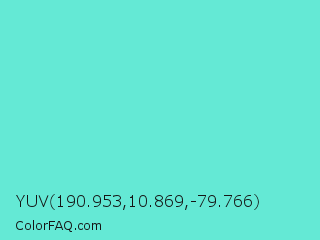 YUV 190.953,10.869,-79.766 Color is a light cyan color and the nearest color is Aquamarine Blue #71d9e2. Hex code #64e9d5 and RGB value is rgb(100,233,213). In RGB color space, this color is composed of 39% red, 91% green, 84% blue, In CMYK color space, this color is composed of 57% cyan, 0% magenta, 9% yellow , 9% black , In HSL color space, this color has a hue angle of 171° , 75% saturation and 65% lightness.