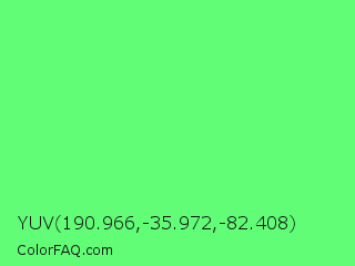 YUV 190.966,-35.972,-82.408 Color is a light green color and the nearest color is Screamin Green #66ff66. Hex code #61fd76 and RGB value is rgb(97,253,118). In RGB color space, this color is composed of 38% red, 99% green, 46% blue, In CMYK color space, this color is composed of 62% cyan, 0% magenta, 53% yellow , 1% black , In HSL color space, this color has a hue angle of 128° , 98% saturation and 69% lightness.