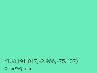 YUV 191.017,-2.966,-75.437 Color is a light green color and the nearest color is Medium Aquamarine #66ddaa. Hex code #69ecb9 and RGB value is rgb(105,236,185). In RGB color space, this color is composed of 41% red, 93% green, 73% blue, In CMYK color space, this color is composed of 56% cyan, 0% magenta, 22% yellow , 7% black , In HSL color space, this color has a hue angle of 157° , 78% saturation and 67% lightness.