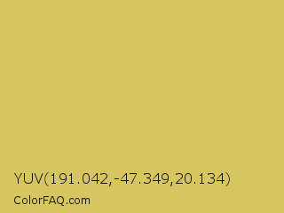 YUV 191.042,-47.349,20.134 Color is a light yellow color and the nearest color is Tacha #d6c562. Hex code #d6c65f and RGB value is rgb(214,198,95). In RGB color space, this color is composed of 84% red, 78% green, 37% blue, In CMYK color space, this color is composed of 0% cyan, 7% magenta, 56% yellow , 16% black , In HSL color space, this color has a hue angle of 52° , 59% saturation and 61% lightness.