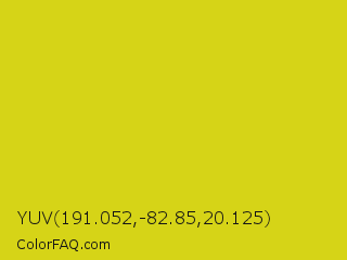 YUV 191.052,-82.85,20.125 Color is a normal yellow color and the nearest color is Bird Flower #d4cd16. Hex code #d6d417 and RGB value is rgb(214,212,23). In RGB color space, this color is composed of 84% red, 83% green, 9% blue, In CMYK color space, this color is composed of 0% cyan, 1% magenta, 89% yellow , 16% black , In HSL color space, this color has a hue angle of 59° , 81% saturation and 46% lightness.