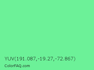 YUV 191.087,-19.27,-72.867 Color is a light green color and the nearest color is Very Light Malachite Green #64e986. Hex code #6cf198 and RGB value is rgb(108,241,152). In RGB color space, this color is composed of 42% red, 95% green, 60% blue, In CMYK color space, this color is composed of 55% cyan, 0% magenta, 37% yellow , 5% black , In HSL color space, this color has a hue angle of 140° , 83% saturation and 68% lightness.
