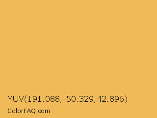 YUV 191.088,-50.329,42.896 Color is a light orange color and the nearest color is Casablanca #f8b853. Hex code #f0ba59 and RGB value is rgb(240,186,89). In RGB color space, this color is composed of 94% red, 73% green, 35% blue, In CMYK color space, this color is composed of 0% cyan, 23% magenta, 63% yellow , 6% black , In HSL color space, this color has a hue angle of 39° , 83% saturation and 65% lightness.