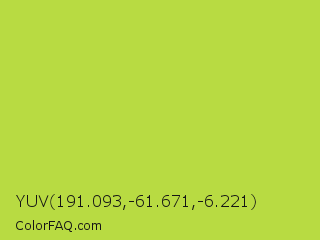 YUV 191.093,-61.671,-6.221 Color is a normal lime color and the nearest color is Conifer #acdd4d. Hex code #b8db42 and RGB value is rgb(184,219,66). In RGB color space, this color is composed of 72% red, 86% green, 26% blue, In CMYK color space, this color is composed of 16% cyan, 0% magenta, 70% yellow , 14% black , In HSL color space, this color has a hue angle of 74° , 68% saturation and 56% lightness.