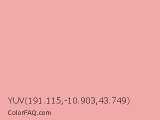 YUV 191.115,-10.903,43.749 Color is a light red color and the nearest color is Rose Bud #fbb2a3. Hex code #f1aaa9 and RGB value is rgb(241,170,169). In RGB color space, this color is composed of 95% red, 67% green, 66% blue, In CMYK color space, this color is composed of 0% cyan, 29% magenta, 30% yellow , 5% black , In HSL color space, this color has a hue angle of 1° , 72% saturation and 80% lightness.