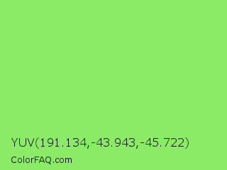 YUV 191.134,-43.943,-45.722 Color is a light green color and the nearest color is Pastel Green #77dd77. Hex code #8beb66 and RGB value is rgb(139,235,102). In RGB color space, this color is composed of 55% red, 92% green, 40% blue, In CMYK color space, this color is composed of 41% cyan, 0% magenta, 57% yellow , 8% black , In HSL color space, this color has a hue angle of 103° , 77% saturation and 66% lightness.