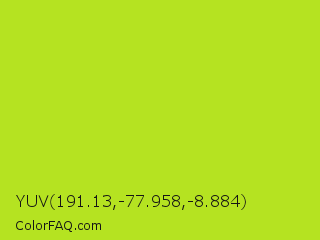 YUV 191.13,-77.958,-8.884 Color is a normal lime color and the nearest color is Inch Worm #b0e313. Hex code #b5e321 and RGB value is rgb(181,227,33). In RGB color space, this color is composed of 71% red, 89% green, 13% blue, In CMYK color space, this color is composed of 20% cyan, 0% magenta, 85% yellow , 11% black , In HSL color space, this color has a hue angle of 74° , 78% saturation and 51% lightness.