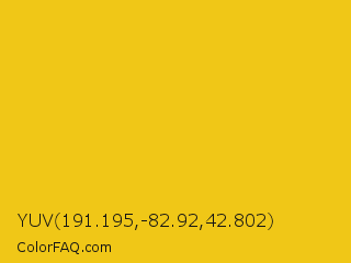 YUV 191.195,-82.92,42.802 Color is a normal yellow color and the nearest color is Jonquil #f4ca16. Hex code #f0c717 and RGB value is rgb(240,199,23). In RGB color space, this color is composed of 94% red, 78% green, 9% blue, In CMYK color space, this color is composed of 0% cyan, 17% magenta, 90% yellow , 6% black , In HSL color space, this color has a hue angle of 49° , 88% saturation and 52% lightness.