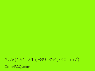 YUV 191.245,-89.354,-40.557 Color is a normal green color and the nearest color is Chartreuse #7fff00. Hex code #91fa0a and RGB value is rgb(145,250,10). In RGB color space, this color is composed of 57% red, 98% green, 4% blue, In CMYK color space, this color is composed of 42% cyan, 0% magenta, 96% yellow , 2% black , In HSL color space, this color has a hue angle of 86° , 96% saturation and 51% lightness.