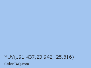YUV 191.437,23.942,-25.816 Color is a light blue color and the nearest color is Baby Blue Eyes #a1caf1. Hex code #a2c5f0 and RGB value is rgb(162,197,240). In RGB color space, this color is composed of 64% red, 77% green, 94% blue, In CMYK color space, this color is composed of 33% cyan, 18% magenta, 0% yellow , 6% black , In HSL color space, this color has a hue angle of 213° , 72% saturation and 79% lightness.