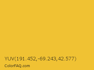 YUV 191.452,-69.243,42.577 Color is a normal orange color and the nearest color is Saffron #f4c430. Hex code #f0c233 and RGB value is rgb(240,194,51). In RGB color space, this color is composed of 94% red, 76% green, 20% blue, In CMYK color space, this color is composed of 0% cyan, 19% magenta, 79% yellow , 6% black , In HSL color space, this color has a hue angle of 45° , 86% saturation and 57% lightness.