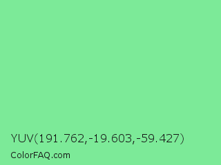 YUV 191.762,-19.603,-59.427 Color is a light green color and the nearest color is Light Green #90ee90. Hex code #7cea98 and RGB value is rgb(124,234,152). In RGB color space, this color is composed of 49% red, 92% green, 60% blue, In CMYK color space, this color is composed of 47% cyan, 0% magenta, 35% yellow , 8% black , In HSL color space, this color has a hue angle of 135° , 72% saturation and 70% lightness.