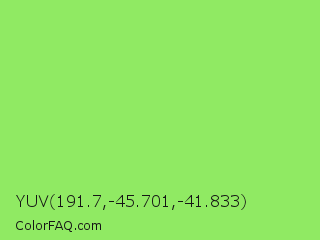 YUV 191.7,-45.701,-41.833 Color is a light green color and the nearest color is Pastel Green #77dd77. Hex code #90ea63 and RGB value is rgb(144,234,99). In RGB color space, this color is composed of 56% red, 92% green, 39% blue, In CMYK color space, this color is composed of 38% cyan, 0% magenta, 58% yellow , 8% black , In HSL color space, this color has a hue angle of 100° , 76% saturation and 65% lightness.