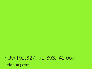 YUV 191.827,-71.893,-41.067 Color is a normal green color and the nearest color is Spring Frost #87ff2a. Hex code #91f42e and RGB value is rgb(145,244,46). In RGB color space, this color is composed of 57% red, 96% green, 18% blue, In CMYK color space, this color is composed of 41% cyan, 0% magenta, 81% yellow , 4% black , In HSL color space, this color has a hue angle of 90° , 90% saturation and 57% lightness.