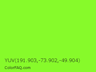 YUV 191.903,-73.902,-49.904 Color is a normal green color and the nearest color is Spring Frost #87ff2a. Hex code #87fa2a and RGB value is rgb(135,250,42). In RGB color space, this color is composed of 53% red, 98% green, 16% blue, In CMYK color space, this color is composed of 46% cyan, 0% magenta, 83% yellow , 2% black , In HSL color space, this color has a hue angle of 93° , 95% saturation and 57% lightness.