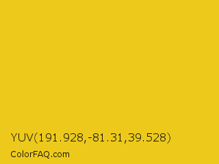 YUV 191.928,-81.31,39.528 Color is a normal yellow color and the nearest color is Deep Lemon #f5c71a. Hex code #edc91b and RGB value is rgb(237,201,27). In RGB color space, this color is composed of 93% red, 79% green, 11% blue, In CMYK color space, this color is composed of 0% cyan, 15% magenta, 89% yellow , 7% black , In HSL color space, this color has a hue angle of 50° , 85% saturation and 52% lightness.