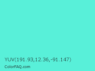 YUV 191.93,12.36,-91.147 Color is a light cyan color and the nearest color is Turquoise #40e0d0. Hex code #58f0d9 and RGB value is rgb(88,240,217). In RGB color space, this color is composed of 35% red, 94% green, 85% blue, In CMYK color space, this color is composed of 63% cyan, 0% magenta, 10% yellow , 6% black , In HSL color space, this color has a hue angle of 171° , 84% saturation and 64% lightness.
