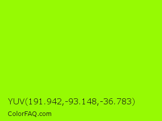 YUV 191.942,-93.148,-36.783 Color is a normal green color and the nearest color is Spring Bud #a7fc00. Hex code #96fa03 and RGB value is rgb(150,250,3). In RGB color space, this color is composed of 59% red, 98% green, 1% blue, In CMYK color space, this color is composed of 40% cyan, 0% magenta, 99% yellow , 2% black , In HSL color space, this color has a hue angle of 84° , 98% saturation and 50% lightness.