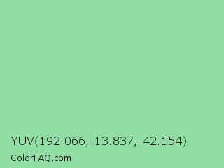 YUV 192.066,-13.837,-42.154 Color is a light green color and the nearest color is Vista Blue #8fd6b4. Hex code #90dea4 and RGB value is rgb(144,222,164). In RGB color space, this color is composed of 56% red, 87% green, 64% blue, In CMYK color space, this color is composed of 35% cyan, 0% magenta, 26% yellow , 13% black , In HSL color space, this color has a hue angle of 135° , 54% saturation and 72% lightness.