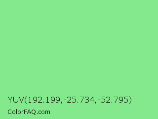 YUV 192.199,-25.734,-52.795 Color is a light green color and the nearest color is Light Green #90ee90. Hex code #84e98c and RGB value is rgb(132,233,140). In RGB color space, this color is composed of 52% red, 91% green, 55% blue, In CMYK color space, this color is composed of 43% cyan, 0% magenta, 40% yellow , 9% black , In HSL color space, this color has a hue angle of 125° , 70% saturation and 72% lightness.